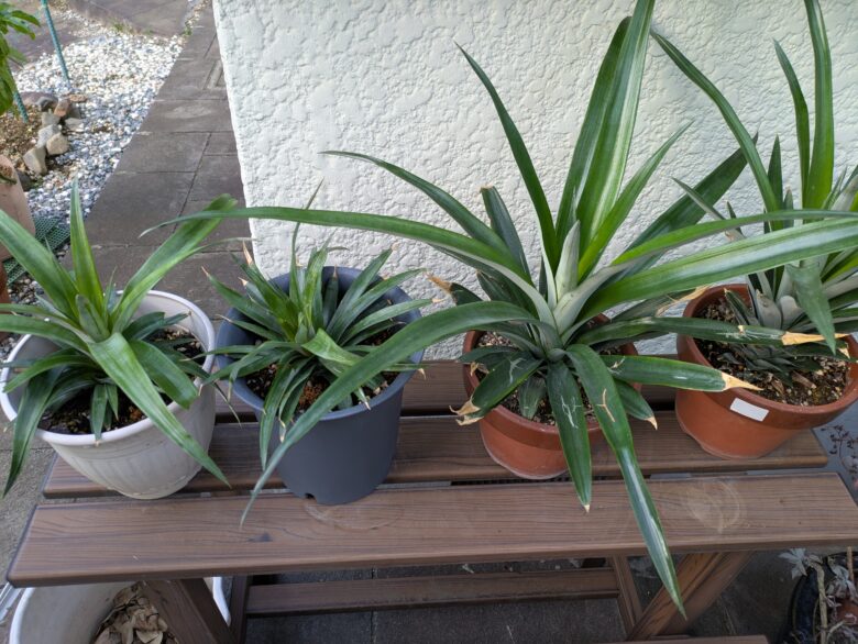 2025年9月25日 / 最終更新日時 : 2025年10月5日 2Z7crE%P(h 未分類 2025/09/25 パイナップルパイナップル お好きですか?甘酸っぱくて私は大好きです。あるご家庭にお邪魔した際に、パイナップル栽培を目にして、これは面白いと始めて見ました。何度か試行錯誤しましたが、、①葉っぱの中心が残っているものを買う②実の部分は完全に切り落とす(残っていると腐る)③葉を10枚ぐらいはぎ取る。で、水栽培すると、1週間ほどで根が出てきます。 これをブルーベリー用培養土(酸性が良いらしい)に植えます。 暑い夏が幸いしたのか、よく育っています。左2つの短い葉は「台湾産」右2つは「フィリッピン産」のパイナップルです。これから寒い時期は室内に入れないといけません。で、肝心の実が生るのは3年後らしいです。